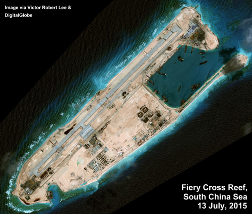 Những bức ảnh vệ tinh chụp của Digital Globe ngày 13/7 tại bãi đá Chữ Thập, thuộc quần đảo Trường Sa của Việt Nam, càng củng cố thêm nhận định của một tư lệnh hải quân Mỹ rằng, đường băng tại đây sẽ đi vào hoạt động sớm hơn dự kiến vào cuối năm nay.
