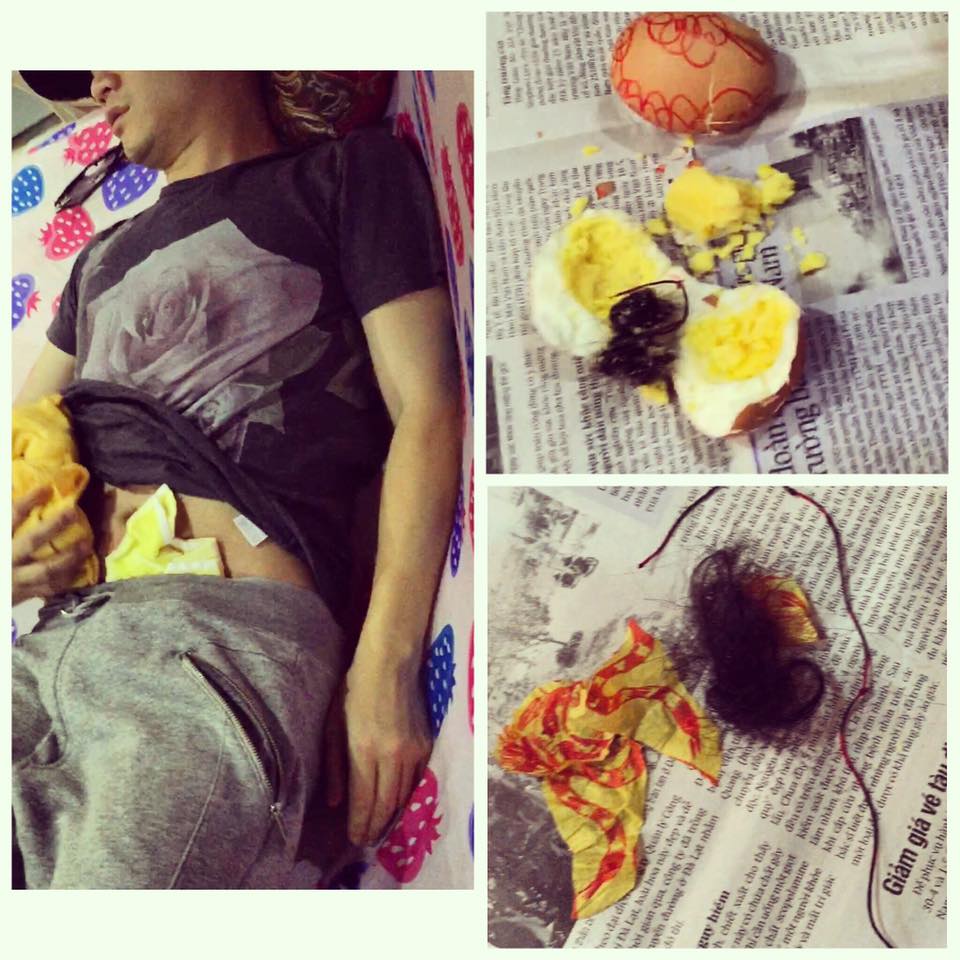 Hình ảnh Đỗ Mạnh Cường lăn trứng để lấy búi tóc từ trong người