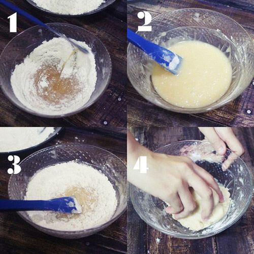 Bước 2: Hỗn hợp bột sau khi trộn sẽ không dính tay. Bạn chia hỗn hợp này thành 4 phần đều nhau rồi lần lượt nặn thành hình con heo.