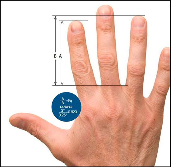 Để thuận tiện cho việc nghiên cứu, các nhà khoa học đã tạo nên một chỉ số gọi là Fq. Hiểu một cách đơn giản, Fq là thương số của độ dài ngón trỏ và độ dài ngón áp út. Nếu ngón trỏ dài 7cm và ngón áp út dài 8cm thì ta có Fq bằng 7 : 8 = 0,875.