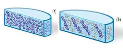 Cấu trúc hạt của oobleck khi bình thường (a) và khi chịu áp lực (b).