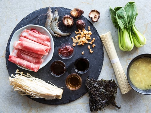- 250ml nước luộc gà; 100g nấm kim châm; 4 cái nấm hương; 2 cây cải chíp; 2 con tôm tươi; 6 lát thịt bò; 200g mì; 1 muỗng canh dầu hào; 1 muỗng canh tương ớt; 1 muỗng cà phê nước mắm
