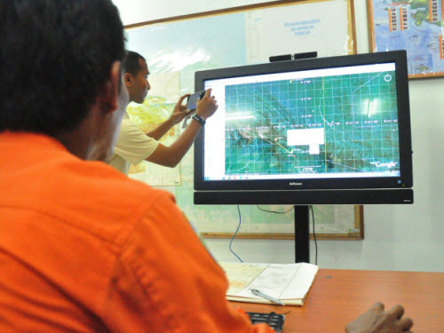 Các thành viên của Cơ quan tìm kiếm và cứu hộ Indonesia đang khảo sát địa hình nơi phát hiện mảnh vỡ máy bay.