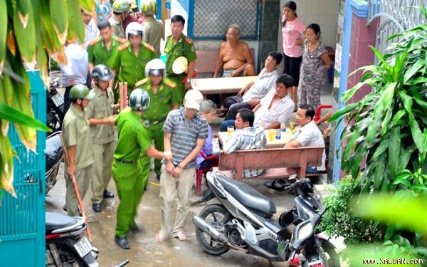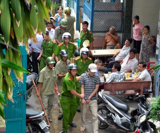 Thấy Hoàng hung hãn khác thường, người cha đã trình báo công an. Một lúc sau có hơn chục cán bộ công an P.8 có mặt tại hiện trường nhưng đối tượng hung hăng vung dao đòi chém cả công an phường rồi chạy vào nhà cố thủ.