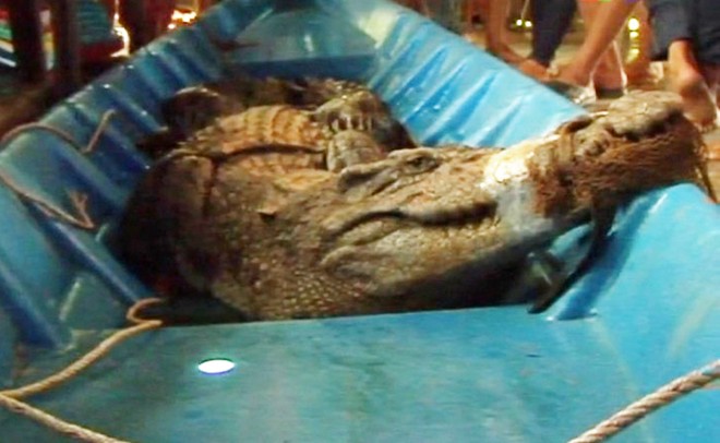 Cá sấu nặng hơn 50 kg, dài 2,2 m được kéo lên xuồng đưa vào bờ. Ảnh: Nhật Tân.
