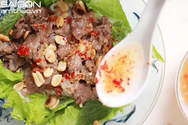 - Khi ăn bạn cho rau sống vào tô trước, sau đó lần lượt cho bánh phở, thịt bò xào, đậu phộng rang dã dập, chan nước trộn đã hâm nóng lên, trộn đều và thưởng thức.