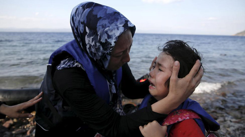 Hai mẹ con người Afghanistan òa khóc sau khi chiếc thuyền chở họ tới được đảo Lesbos, Hy Lạp, hôm 23/8.