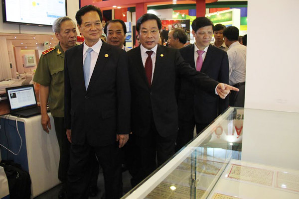 Thủ tướng dừng chân rất lâu trước gian trưng bày của Bộ TT&TT với các bằng chứng lịch sử và pháp lý về Hoàng Sa, Trường Sa của VN.