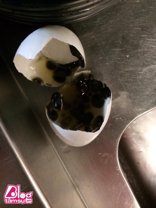 Thế nhưng điều kì lạ xảy ra khi anh đập quả trứng đầu tiên, bên trong quả trứng không phải là lòng trắng và lòng đỏ như bình thường, mà thay vào đó là những viên tròn màu đen. “Nhìn thoáng qua tôi còn tưởng quả trứng này có chứa ngọc trai đen, nhưng nhìn kĩ thì những viên kì dị này mềm nhũn như trân châu có trong trà sữa.” – Chàng trai này chia sẻ.