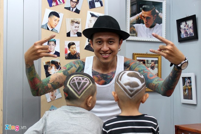 Nằm trong một con hẻm nhỏ ở quận 3, TP HCM, tiệm hớt tóc nghệ thuật của Nguyễn Huỳnh Thanh Liêm (sinh năm 1987) hàng ngày thu hút đông đảo bạn trẻ Sài thành. Điểm độc đáo nhất của tiệm này là tattoo hair (xăm lên tóc) do Thanh Liêm tự tìm tòi và phát triển. Trong ảnh, Thanh Liêm vừa thực hiện xong hình xăm biểu tượng siêu nhân và kim cương cho hai khách nhí.