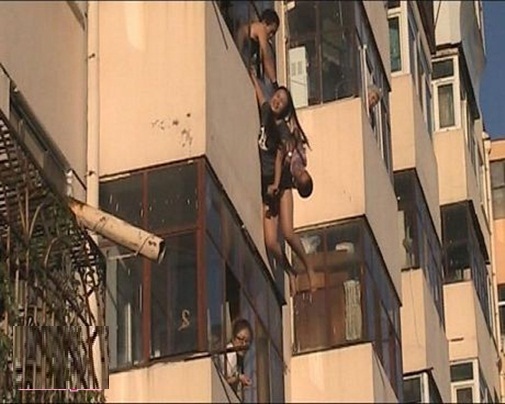 Khi đó, người bạn trai đă nhanh trí chạy xuống tầng dưới cầu cứu người hàng xóm. Đứng ở ban công tầng dưới nhà cô gái, người đàn ông đă tḥ đầu ra ban công và thuyết phục bạn gái đừng nhảy xuống.