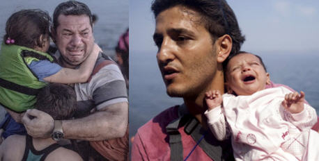 Những người di cư xuất phát từ Thổ Nhĩ Kỳ lên bờ sau khi lênh đênh trên biển trên một chiếc thuyền nhỏ chật chội để đến đảo Lesbos, một địa điểm du lịch nổi tiếng ở Hy Lạp. Sa lầy trong cuộc khủng hoảng kinh tế, Hy Lạp đang gặp khó khăn khi các trung tâm tiếp nhận di dân bị quá tải. Trong khi đó, các tình nguyện viên, khách du lịch và người Hy Lạp, đã cùng nhau giúp đỡ những di dân, cho họ bánh, nước và đôi khi cả quần áo khô. Ảnh: NYTimes