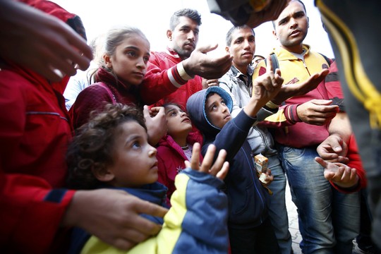 Người di cư được phân phối thực phẩm khi chờ xe lửa đến Áo và Đức tại nhà ga ở Hegyeshalom - Hungary hôm 7-9 Ảnh: REUTERS