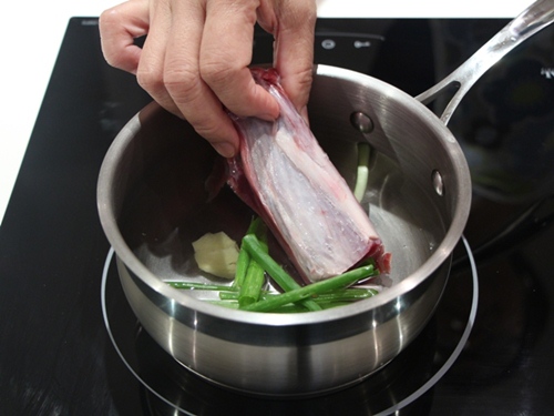 Bước 1: Cho nước vào trong một nồi sau đó thêm hành và gừng vào. Rồi cho thịt bò vào. Đun ở lửa lớn. Sau khi nước sôi, hạ lửa, đun trong 3 phút nữa, vớt ra.