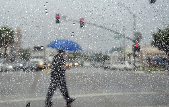 Một người đang đi trong mưa tại Los Angeles vào sáng thứ Ba. Có ít nhất tám người bị nước lũ cuốn trôi và được cứu tại sông San Gabriel River trong vùng Los Angeles. Ở Quận Cam, ba người từng gặp nguy hiểm trong một kênh nước ở Huntington Beach gần đường Brookhurst. Hàng ngàn ngôi nhà đã bị cúp điện, và hàng chục tai nạn đã xảy ra trên hệ thống xa lộ chung quanh Los Angeles và Quận Cam. (Frederic J. Brown/Getty Images)