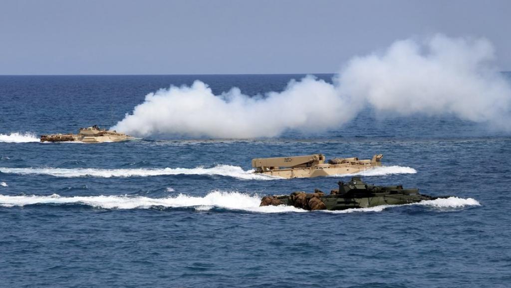 Lực lượng Mỹ trên chiếc tàu đổ bộ tấn công tập trận trên Biển Đông với quân đội Philippines ngày 21/04/ 2015.