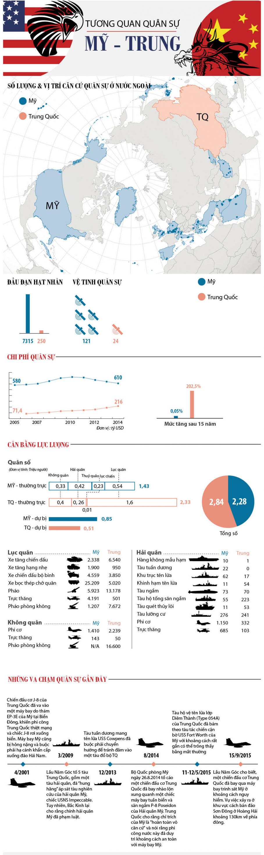 Dưới đây là một vài so sánh về sức mạnh quân sự giữa Mỹ và Trung Quốc trên cơ sở các số liệu mới nhất của Trung tâm Nghiên cứu hòa bình quốc tế Stockholm và báo cáo Cân bằng Quân sự 2015.