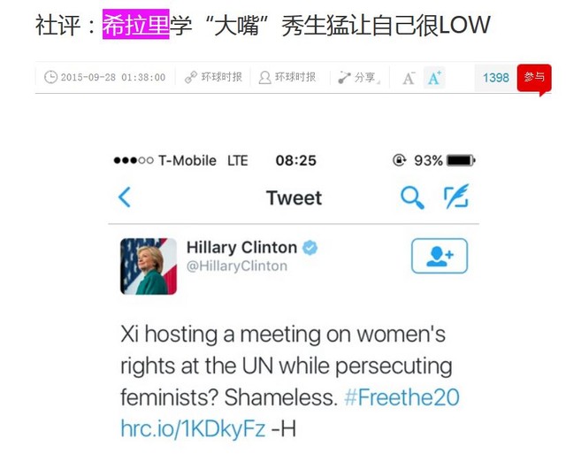 VBF-Phản ứng trước vai trò của ông Tập trong 1 cuộc họp về phụ nữ bà Hillary Clinton đã công khai chỉ trích nhà lãnh đạo này là không ra gì khi cướp quyền của phụ nữ TQ. Ngay lập tức báo chí TQ đã có sự đáp trả nhằm tìm kiếm chút danh dự cho ông Tập.Trung Quốc đã phản ứng sau khi bà Hillary Clinton chỉ trích việc Chủ tịch Trung Quốc Tập Cận Bình chủ trì một hội nghị về quyền phụ nữ tại LHQ là hành động "không biết xấu hổ".