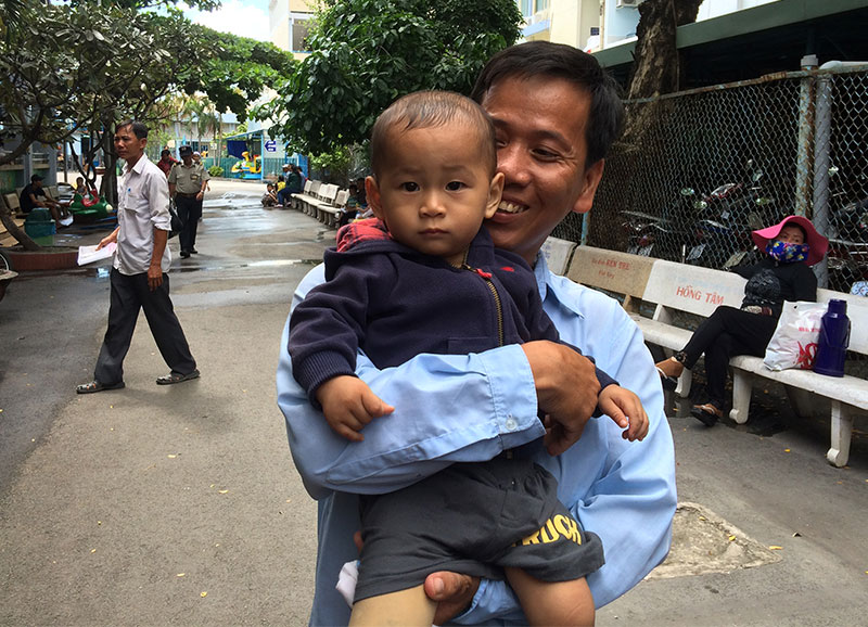 Bé trai văng khỏi bụng mẹ gần 1 năm trước đã trở lại bệnh viện để khám lại. Các bán sỹ đã tận tình đói tiếp bé rất tốt. Mọi theo dõi đếu cho thấy bé phát triển bình thường.Gia đình bé trái cảm thấy rất may mắn vì bé đã có chân giả và có thể tập đi được.