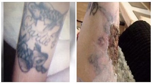Không có tiền xóa hình xăm bằng lazer, cô gái người Anh đã tự tìm loại thuốc trên mạng và tự xử. Nhưng kết quả thật kinh khủng khi cô bị thối rữa hoàn toàn chỗ thịt mà cô bôi thuốc xóa hình xăm. Đau đớn và tuyệt vọng không biết bao giờ cô mới khỏi.