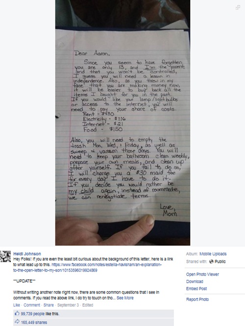 Người làm cha làm mẹ luôn muốn những điều tốt nhất cho con cái của mình, bao gồm cả việc bao bọc và quản lý giáo dục con cái, còn về phần người con đến 1 độ tuổi nào đó sẽ muốn được tự sải đôi cánh cử mình để tự bước đi, nhưng đâu có lường trước được những thứ bên ngoài kia đang chờ chúng. Vừa qua cũng đã xảy ra 1 trường hợp cậu bé 13 tuổi phản đối lại mẹ cậu và muốn thể hiện rằng cậu có thể tự lập, người mẹ đã phải ra tối hậu thư trong đó chỉ ra những điều khiến cậu đã phải nghĩ lại.