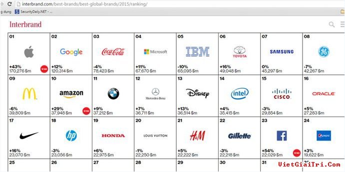 Bảng xếp hạng 100 giá trị thương hiệu nổi tiếng nhất toàn cầu của Interbrand – Ảnh chụp màn hình
