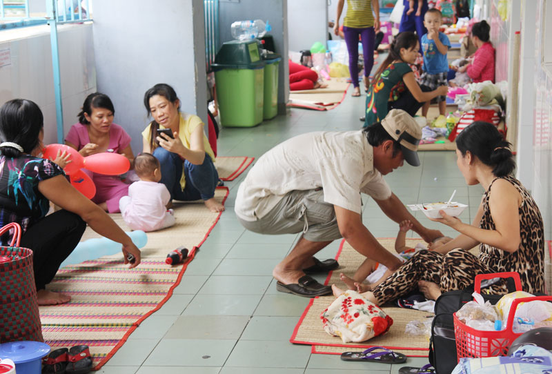 Còn tại Khoa Nhiễm của bệnh viện, anh Nguyễn Văn Hoàng, có con 2 tuổi đang điều trị tay chân miệng nói:"4 - 5 bé/giường. Đó còn chưa kể mỗi bé phải có thêm mẹ hoặc ba chăm sóc. Chúng tôi toàn ứng biến bằng cách chỗ nào trống thì mắc võng, không thì ra hành lang nằm. Đông thế này, ra hành lang nằm thoải mái hơn ở trong phòng."