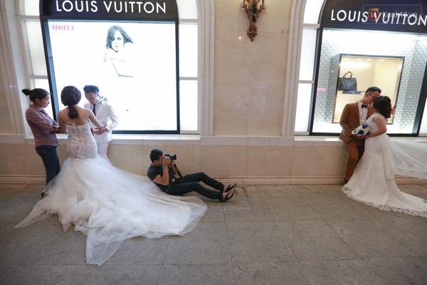 Tại khu vực quanh TTTM Tràng Tiền, cứ cách khoảng 1m lại có một cặp đôi đứng chụp ảnh cưới. Những tiếng ra hiệu như: "Cô dâu nép sát vào chú rể nào, nào hất cằm lên một chút, chạm mũi nhau vào đi..." liên tục vang lên như góp phần khuấy động không gian vốn đã rất nhộn nhịp. Các cặp đôi người đứng, người ngồi, thi nhau tạo đủ mọi kiểu dáng và căng mặt để cười... thế nhưng, chỉ cần ống kính của nhiếp ảnh buông xuống, họ lập tức đứng chùng chân, nhìn nhau trong mệt mỏi.