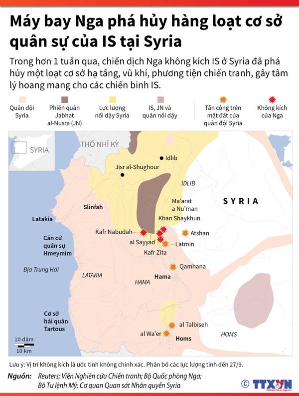 Như đã đưa tin trước đây, Nga đồng ý tham gia giúp Syria chống IS là nhờ có tổn thống Iraq cùng với tấm bản đồ đánh dấu cức điểm IS. Dưới đây là đồ họa những bị tiêu của lực lượng này bị Nga tiêu diệt trên khắp lãnh thổ Syria.
