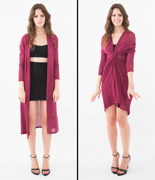 Với chiếc cardigan quá dài và lôi thôi, bạn dễ dàng biến nó trở thành chiếc váy cocktail đơn giản bằng cách thắt nút ở phía trước. Tuy nhiên, để làm được điều này thì chiếc cardigan của bạn phải đủ rộng và đủ nhẹ để thắt nút dễ dàng.