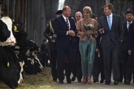 Quốc vương Willem-Alexander và Hoàng hậu Maxima thăm một trại bò sữa ở Bắc Kinh. Ảnh: AP