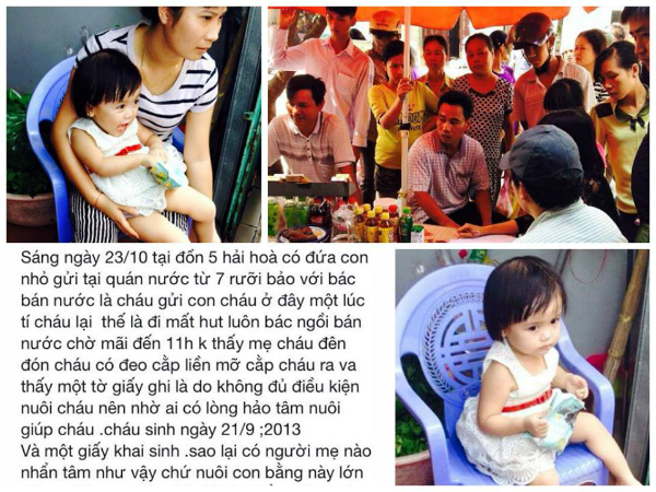 Theo chia sẻ của nickname P.V.T, khoảng 7h30 phút sáng ngày 23/10 một người phụ nữ bế cháu bé đến gửi tại quán nước phường Hải Hòa (TP Móng Cái, tỉnh Quảng Ninh). Người phụ nữ trên còn nhờ chủ quán trông hộ cháu bé vài phút rồi sẽ quay lại. Tuy nhiên mãi cho đến 11h trưa cùng ngày vẫn không có ai đến nhận em bé. Người chủ hàng nước bèn mở cặp sách cháu mang theo nhưng chỉ thấy giấy khai sinh của em cùng dòng chữ: "không đủ điều kiện nuôi con nên nhờ ai có lòng hảo tâm nuôi giúp".