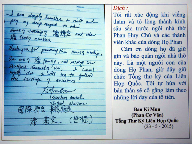 Lưu bút của ông Ban Ki-Moon viết tại nhà thờ họ Phan Huy và bản dịch của dòng họ này