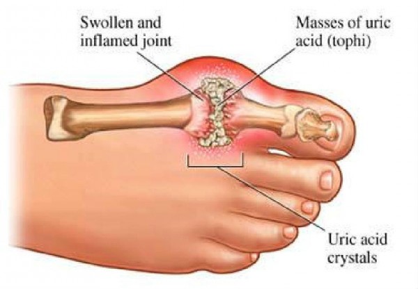 Chế độ ăn uống giàu tính axit, thường bao gồm nội tạng, pho mát lâu năm, sò, nấm và rượu vang, thúc đẩy sự hình thành và kết tủa của tinh thể acid uric. Tinh thể acid uric có thể tích tụ trong thận để tạo thành sỏi hoặc họ có thể lắng đọng trong các khớp xương và gây ra một sự đau đớn thông qua tình trạng viêm khớp gọi là bệnh gút. Tinh thể acid uric gây đau và viêm trong các mô xung quanh.