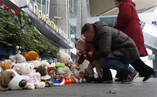 Người dân đặt hoa và đồ chơi trẻ em tại lối đi ở sân bay quốc tế Pulkovo (St.Petersburg) trong ngày quốc tang tưởng niệm các nạn nhân xấu số trên chuyến bay (Ảnh: AP).