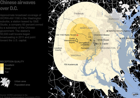 Báo chí địa phương cho biết, nhà chức trách Mỹ đã phát hiện một đài phát thanh tên là WCRW (China Radio Washington) ở Washington có nhiều chương trình bị chính phủ Trung Quốc khống chế về nội dung, phát các nội dung theo quan điểm của họ. Ví dụ, trong nội dung về tình tình căng thẳng ở Biển Đông, đài này không đề cập đến hành động Trung Quốc lấp biển tạo đảo trái phép, mà nhấn mạnh nguyên nhân gây nên tình hình căng thẳng là “do thế lực bên ngoài mượn cớ tranh chấp đảo bãi để nhúng tay vào việc nội bộ khu vực”.