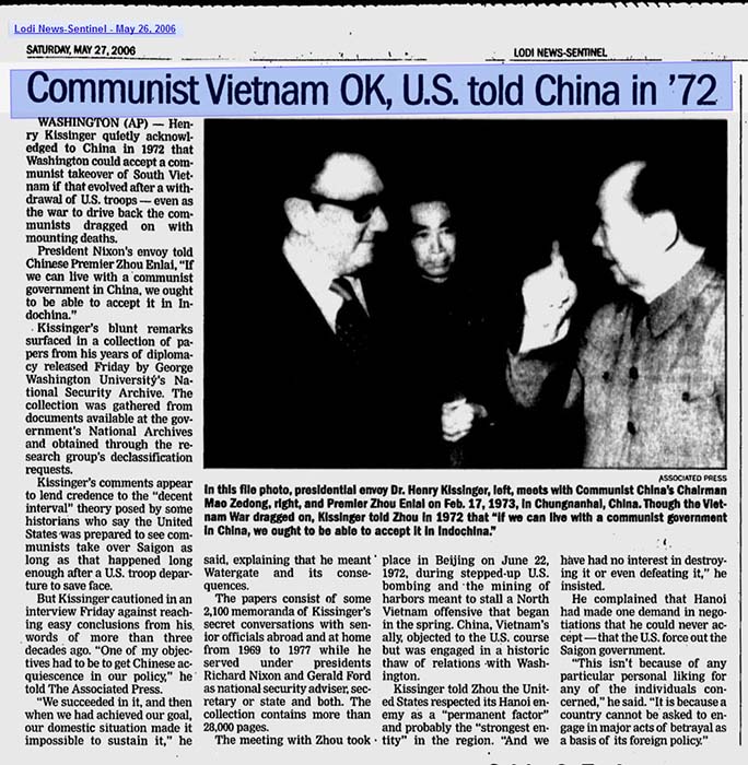 Năm 1968 tôi được nghe một anh bộ đội BV hồi chánh nói: Mỹ muốn chiêu hồi Trung Quốc chứ anh Bắc Việt thì nghĩa lý gì và bốn năm sau nó thành sự thật. Hoa Kỳ đã chiêu hồi được Bắc Kinh, đã giải quyết tận gốc thuyết Domino không còn lo sợ CS bành trướng, họ vội quẳng cái miếng xương Đông Dương đi cho kẻ nghèo hèn lượm.