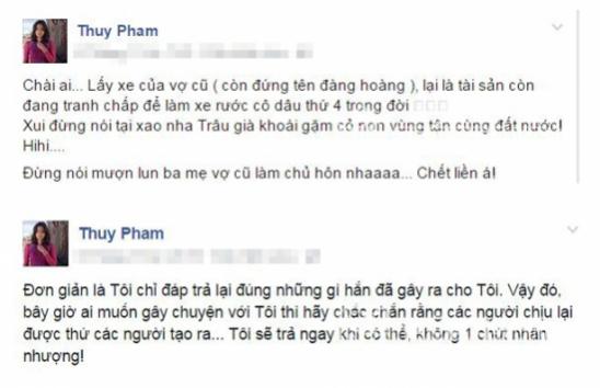Người đẹp này viết: "Thế trận công bằng... Giờ thì đôi bên thanh thiên bạch nhật tất tần tật ra để thiên hạ đều rõ và có thể thẩm định theo thời gian! Bao năm qua, quân tử quá nên để loại tiểu nhân như anh ném đá giấu tay bịa đặt, lật tung cuộc sống tôi không thiếu thứ gì. Giờ tôi chẳng ngại bẩn tay mình đáp trả kẻ hèn hạ như anh. Ngày anh cưới vợ 3 (sau đúng 11 ngày từ buổi ra toà ở Mỹ với tôi ). Tôi chả buồn động đến, còn thông cảm thái độ quay về Việt Nam ngay trong đêm đó không 1 lần xin được gặp con. Tôi đã thật lòng mừng cho anh. Để rồi được gì? 3 tháng sau đó tôi sinh Myles, vừa tròn tháng, anh biết tin và tuồn cho phóng viên đập tôi với cái tít bài hoàn toàn sai sự thật: "Ngọc Thúy có con riêng với luật sư của mình".