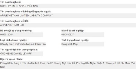 Apple đã chính thức thành lập công ty tại Việt Nam, tuy nhiên thay vì thông báo một cách rầm rộ, công ty đã đi vào hoạt động từ cuối tháng 10 vừa qua một cách âm thầm. Công ty có trụ sở tại Quận 1, TPHCM và số vốn điều lệ 15 tỷ đồng.