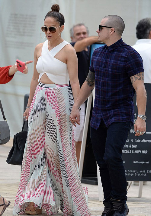 Jennifer Lopez mặc gợi cảm tản bộ trên đường phố Miami cùng người tình. Vũ công Casper Smart không rời tay khỏi J.Lo. Cặp đôi đã tái hợp vào hè vừa qua sau 1 năm chia tay. Jennifer trông rất hạnh phúc khi đi chơi với bồ trẻ vào ngày chủ nhật rảnh rỗi. Đêm trước đó, cô đã có màn trình diễn bốc lửa tại festival âm nhạc Latin iHeartRadio.