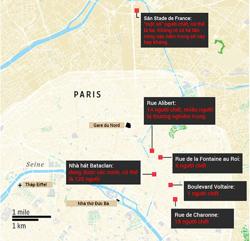 Các vụ tấn công diễn ra gần như đồng thời tại 6 địa điểm khác nhau trên khắp Paris, thể hiện khả năng phối hợp cao của những kẻ khủng bố.