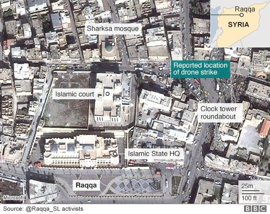 Trên mạng xã hội Twitter, một nhóm quan sát được gọi là “Raqqa đang bị giết chết trong im lặng” đã đăng tải một tấm bản đồ hiển thị vị trí mục tiêu của UAV Anh và Mỹ. Đó là địa điểm nằm gần Tháp Đồng hồ, nơi IS hay thực hiện các vụ hành quyết tù nhân. Nhóm này cũng xác nhận Emwazi đã thiệt mạng.