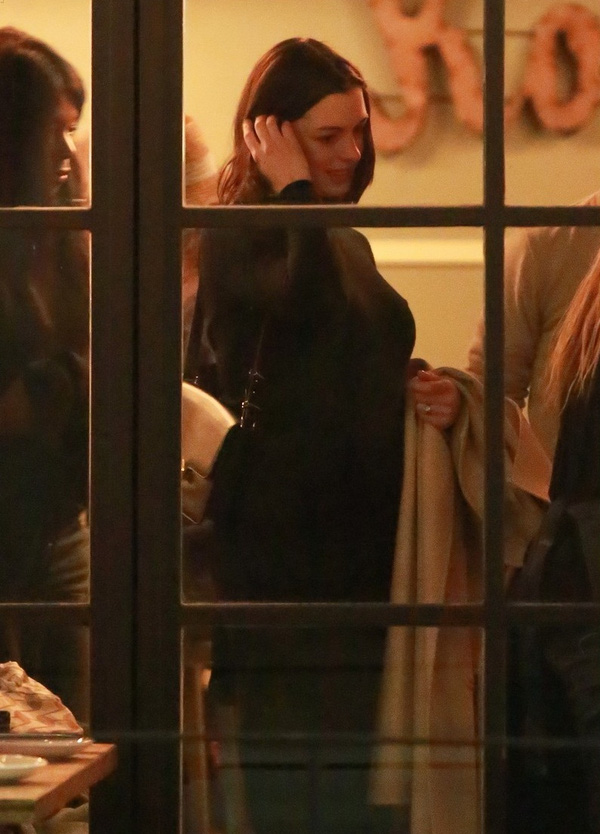 Hai vợ chồng Anne Hathaway dành buổi tối cuối tuần đi ăn cùng với bạn bè thân thiết. Nữ diễn viên vẫn rất xinh đẹp và không thay đổi nhiều khi mang thai. Anne Hathaway khoác áo ngoài màu sữa và đi giày búp bê hình mèo trẻ trung