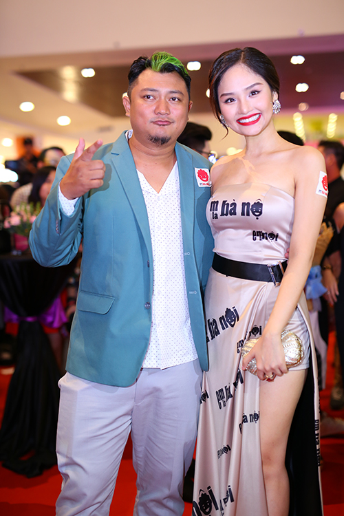 Diễn viên chính của phim 'Em là bà nội của anh' - Miu Lê gây chú ý với bộ váy xẻ vạt cao gợi cảm, in họa tiết là những dòng chữ tên của bộ phim.