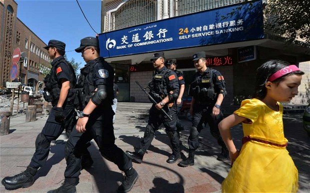 Cảnh sát Trung Quốc tuần tra ở một thành phố tại Tân Cương. Các tổ chức nhân quyền lên án Bắc Kinh đàn áp người Uighur ở Tân Cương - Ảnh: Telegraph