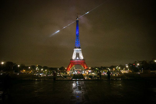 Tháp Eiffel của Pháp chuyển sang màu đỏ, trắng, xanh theo màu quốc kỳ của Pháp sau chuỗi vụ khủng bố đẫm máu tối 13/11 làm 130 người thiệt mạng. Những kẻ tấn công, được cho là thành viên tổ chức khủng bố tự xưng Nhà nước Hồi giáo (IS), gây ra những vụ xả súng và đánh bom liều chết trên khắp thủ đô Paris. Không lâu sau vụ tấn công, Pháp đã phát động chiến dịch không kích nhằm trả đũa IS ở Syria. Tổng thống François Hollande cũng thực hiện chiến dịch ngoại giao con thoi nhằm tìm kiếm các đồng minh trong cuộc chiến chống IS. Ảnh: Getty
