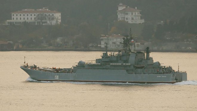 Một tàu chiến Nga đi qua eo biển Bosphorus của Thổ Nhĩ Kỳ.