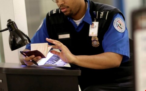 Một nhân viên an ninh kiểm tra hộ chiếu của du khách nhập cảnh vào Mỹ. Ảnh AP
