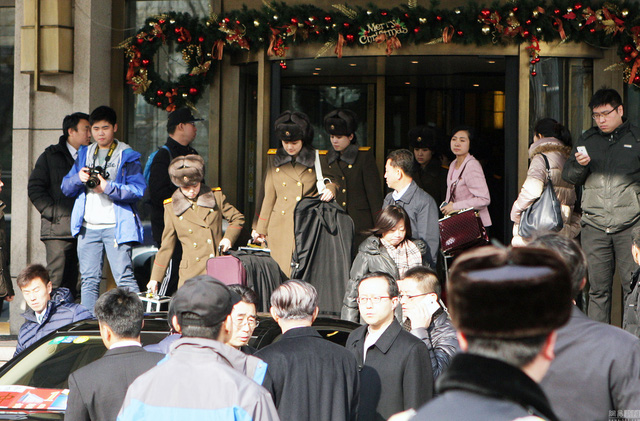 H́nh ảnh các nghệ sĩ Triều Tiên mang hành lư bước ra khỏi Khách sạn Dân tộc ở thủ đô Bắc Kinh hôm 12/12 vẫn được trang Wangyi của Trung Quốc chú thích là "tới chuẩn bị ở Đại kịch viện quốc gia", cho thấy vụ "bỏ về" diễn ra hoàn toàn bất ngờ.
