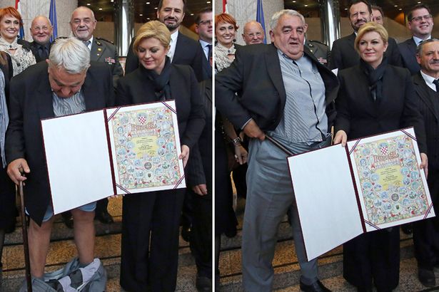 Ivan Zvonimir Cicak, một nhà hoạt động nhân quyền đã ngượng “chín mặt” vì chiếc quần ông đang mặc bỗng nhiên tụt xuống đúng lúc ông đưa tay nhận giải thưởng danh giá từ nữ Tổng thống Croatia bà Grabar Kitarovic.